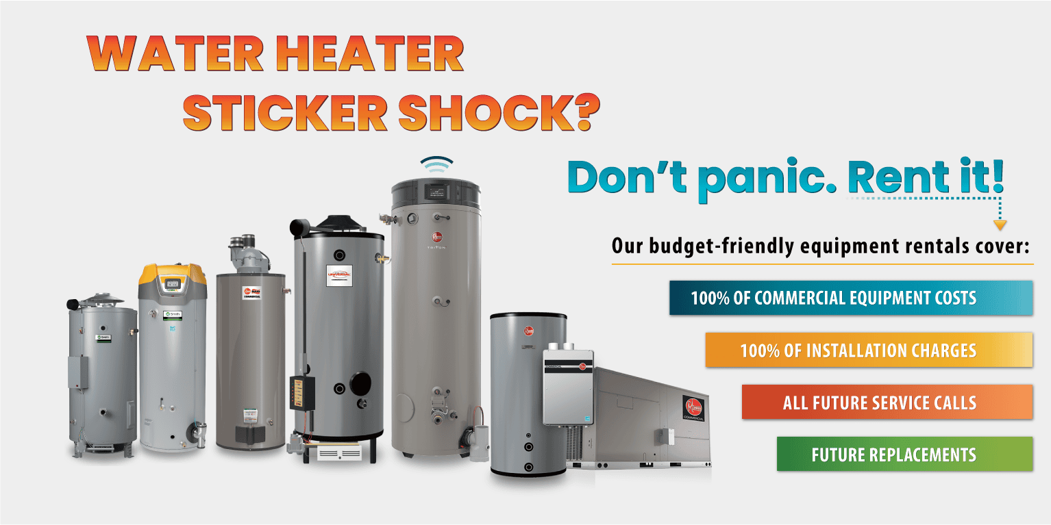 Renting equipment saves you money, time, and headaches. We rent commercial equipment, including water heaters, boilers, softeners, and RTUs.